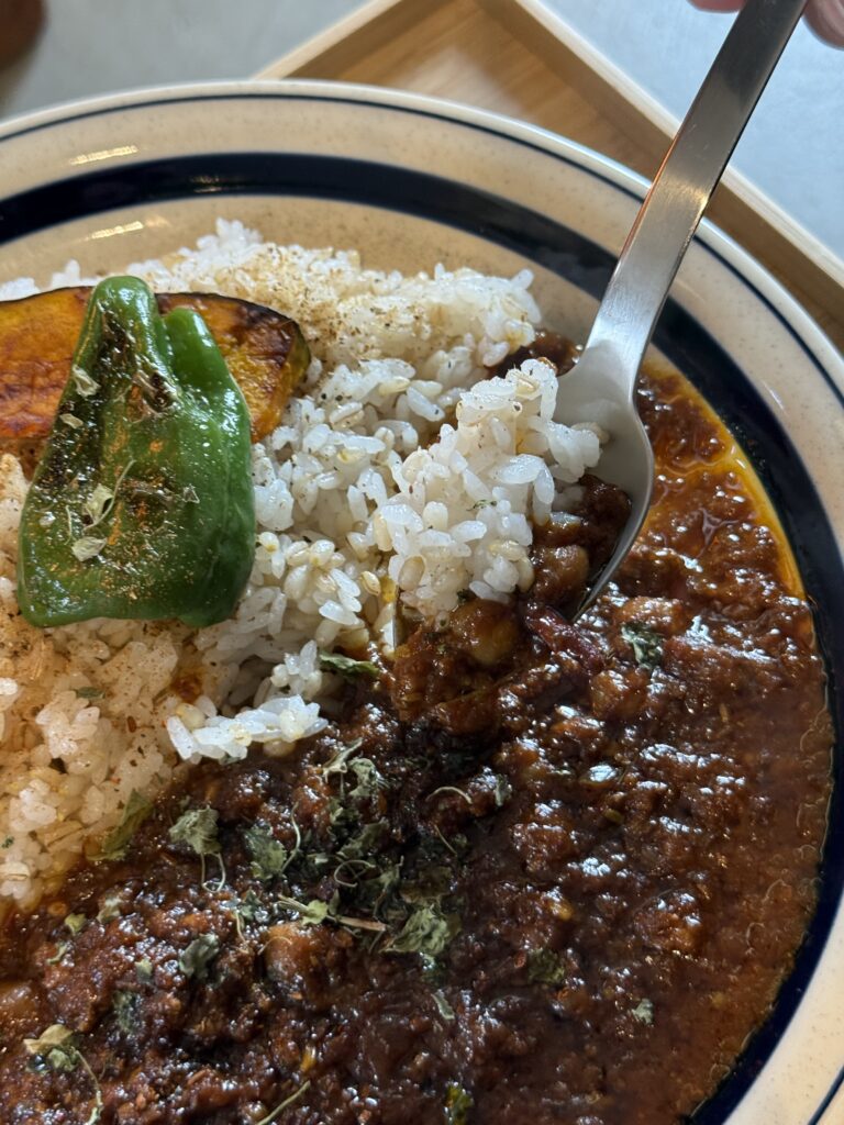 「美味しい、優しい、面白い。」をコンセプトにする地域の食堂喫茶どやな。最近は八丁味噌と粗挽きの豚肉を使った味噌キーマカレーが人気。麦ご飯、季節の野菜、和風玉ねぎピクルスにルーが合わさります。