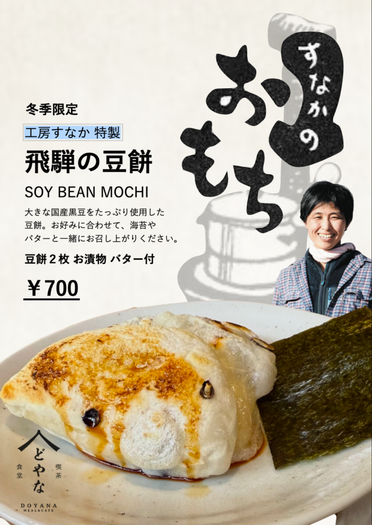 また最近は、河合町工房すなか 特製の豆餅や、三食餅と生クリームが添えられたぜんざいも始まりましたよ!