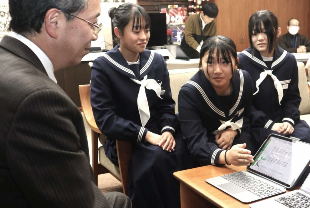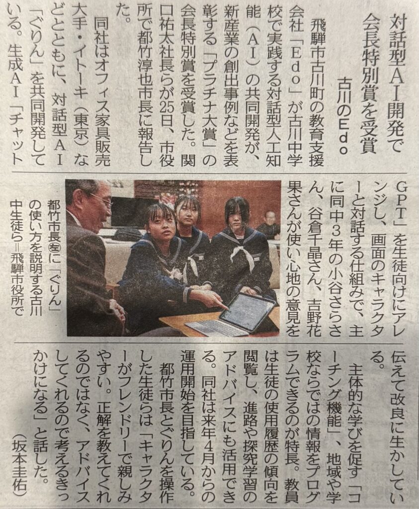 古川中学校の生徒たちと共に実施してきた実証実験が、プラチナ構想ネットワーク主催の「プラチナ大賞」で会長特別賞を受賞され、生徒さんたちが報告においでになりました。このネットワークには、私も首長会員として参加しています。Edoの関口代表、古川中の中村校長も同席されました。教育現場でのAI活用のあり方については、議論が活発に行われており、答えを教えるのではなく、思考を導いていくチューター的なものが必要だという議論が行われていますが、このグリン2はまさしくそうしたものになっています。