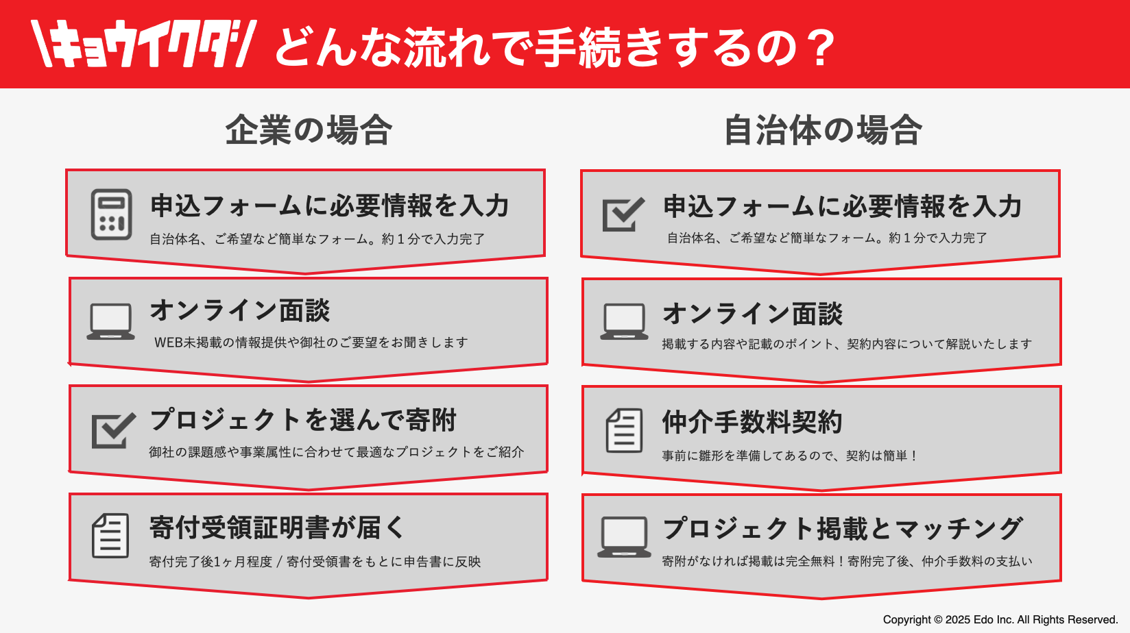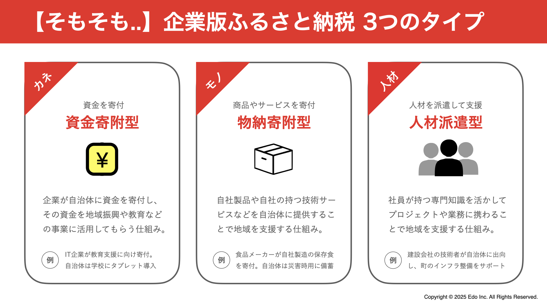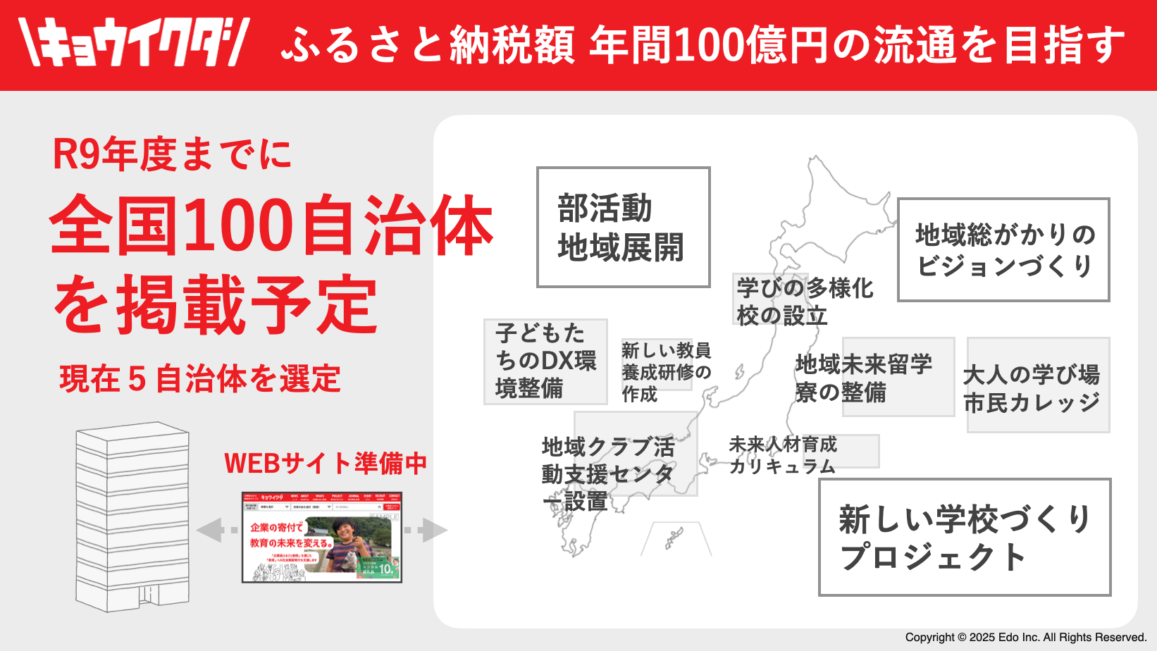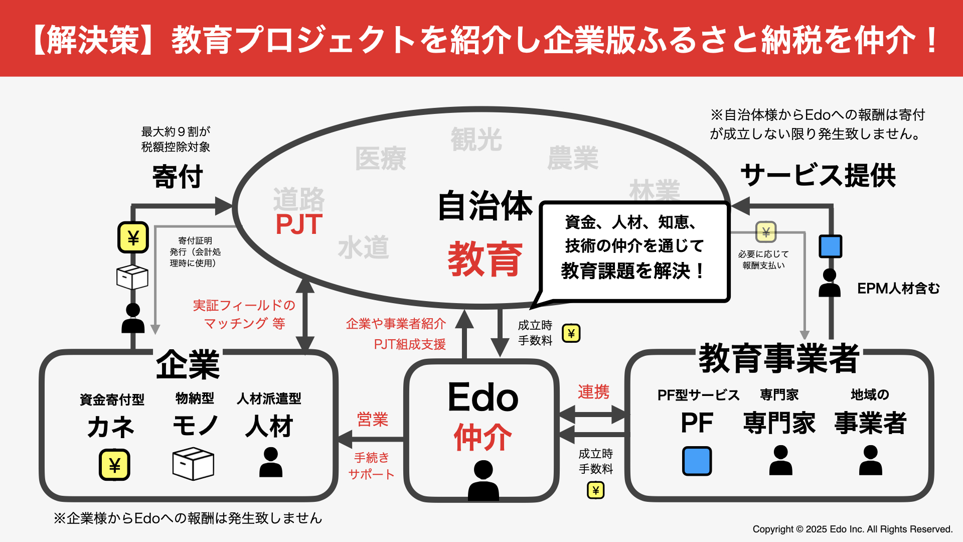 Edoは自治体様と中間支援契約し、チャレンジングな教育の取り組みを把握、企業様に営業します。寄付成立時に成果報酬型で仲介手数料をいただくモデルです。
