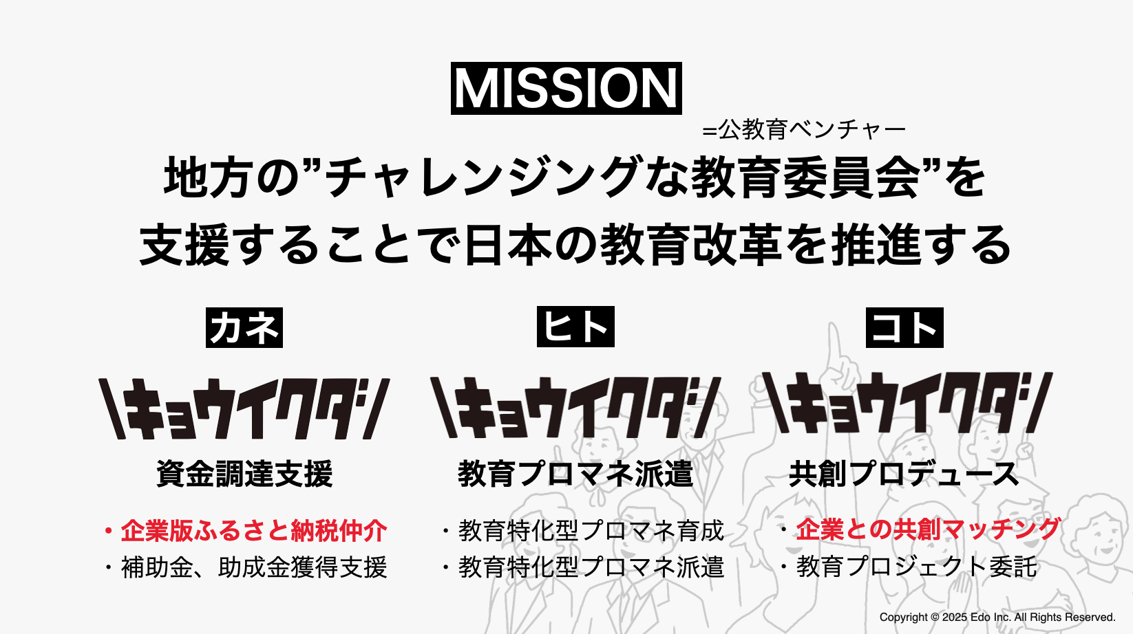 この取り組みは、既存のビジネス的なサービスではありません。みんなが大切だと思ってる「教育」にもっと社会的な資源が流動するよう、その動きを作る「社会運動」です。教育は社会の根幹。そこがもっと変化を起こしていけるよう、社会総がかりでそこに取り組みたいと考えています。共感、ご協力いただける方、ぜひHP問い合わせ欄よりご連絡ください!