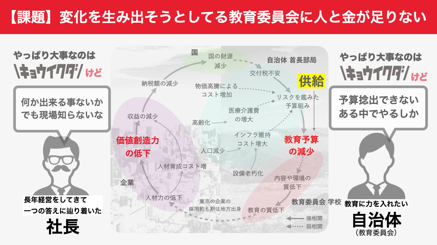 医療介護費の増大、インフラ維持コストの増加、物価高騰などなど費用増加等の影響により、地方の教育領域は何か新しいことをやろうと思っても人と予算が足りない。そんな状況が加速しています。社会的に多くの方が「教育は重要」そう考えているにも関わらず放っておけば、教育が衰退していく構造が生まれています。またそれにより企業、ひいては国全体に大きな影響を及ぼす可能性があります。